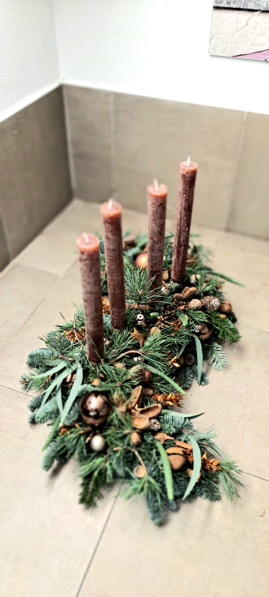 Svíčky rustik, zdobeno baňkami a přírodními ozdobami.