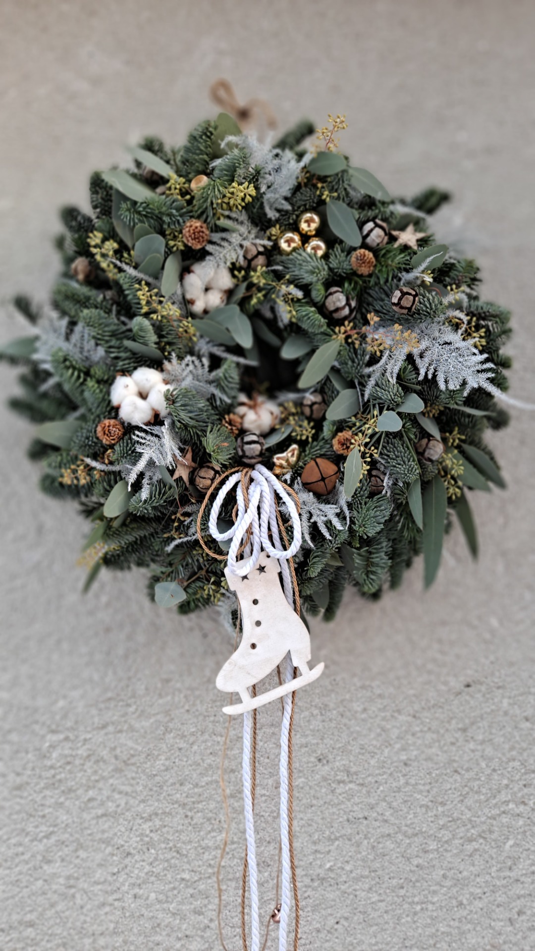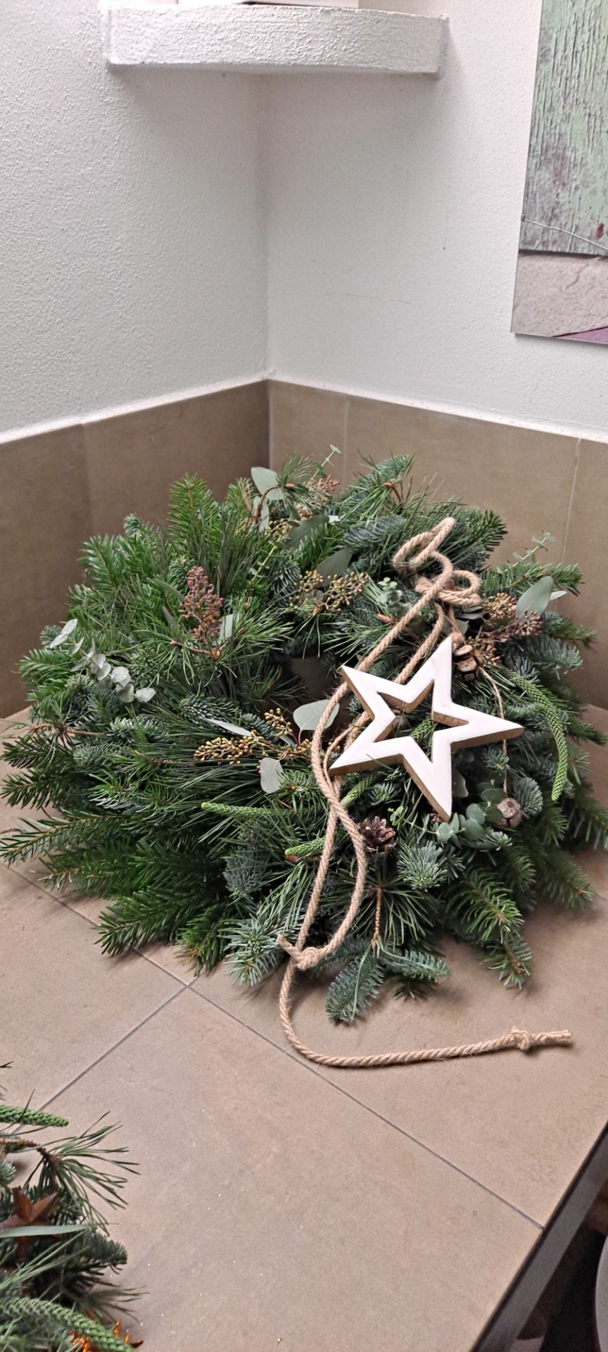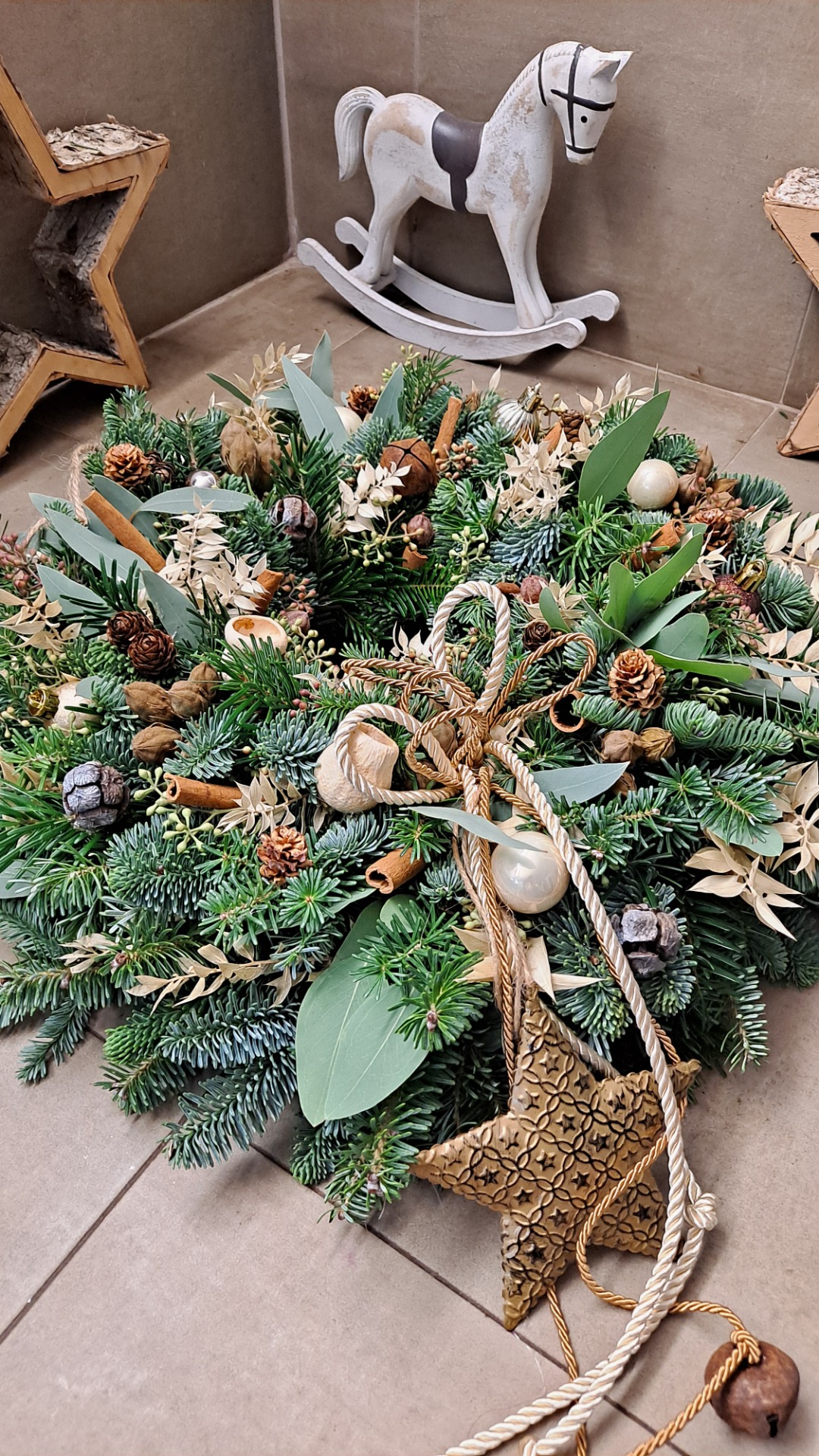 Dokonalý věnec na Vaše dveře, jemné přírodní ozdoby, zlatá hvězda