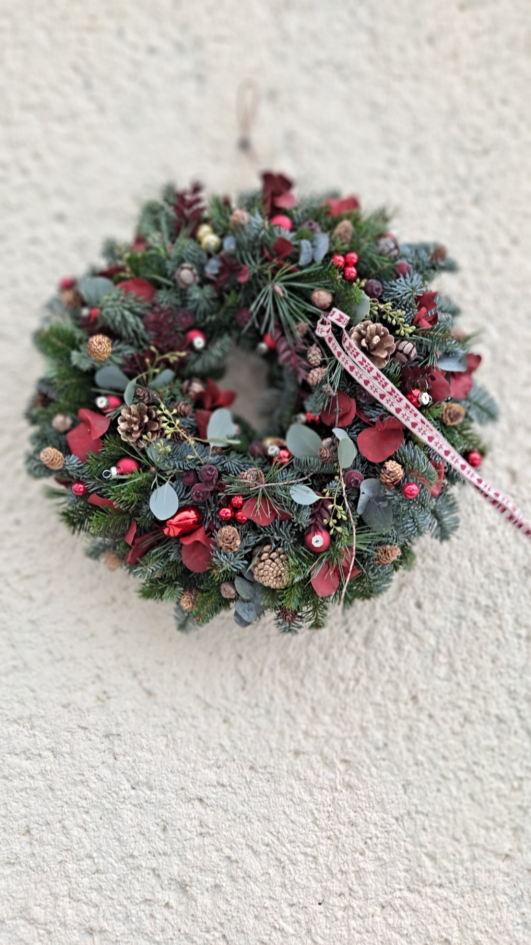 Oblíbený věnec na dveře, přírodní ozdoby, klasika s červenou barvou