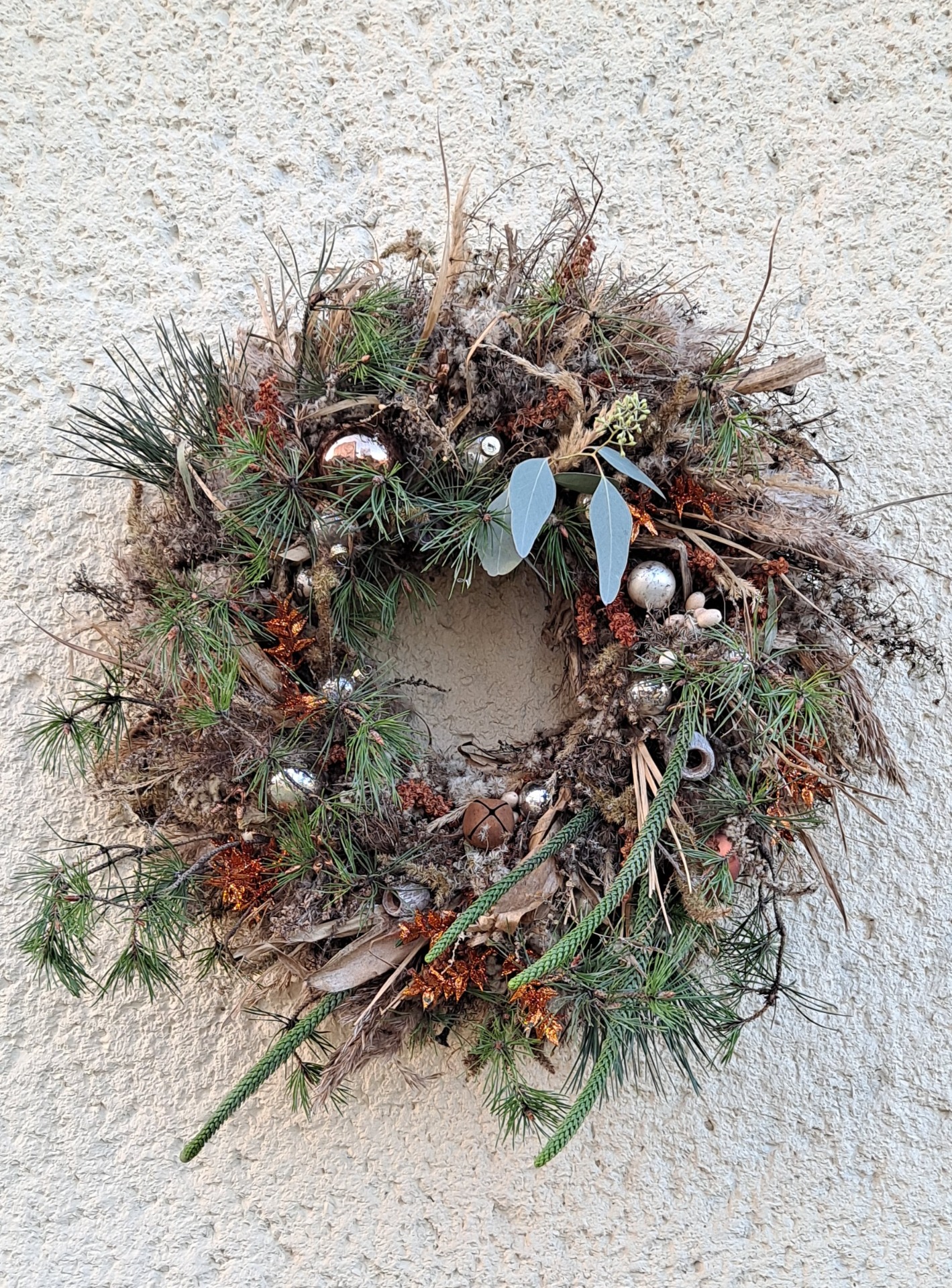 kombinace sušiny a jehličí, doplněný baňkami a přírodními ozdobami